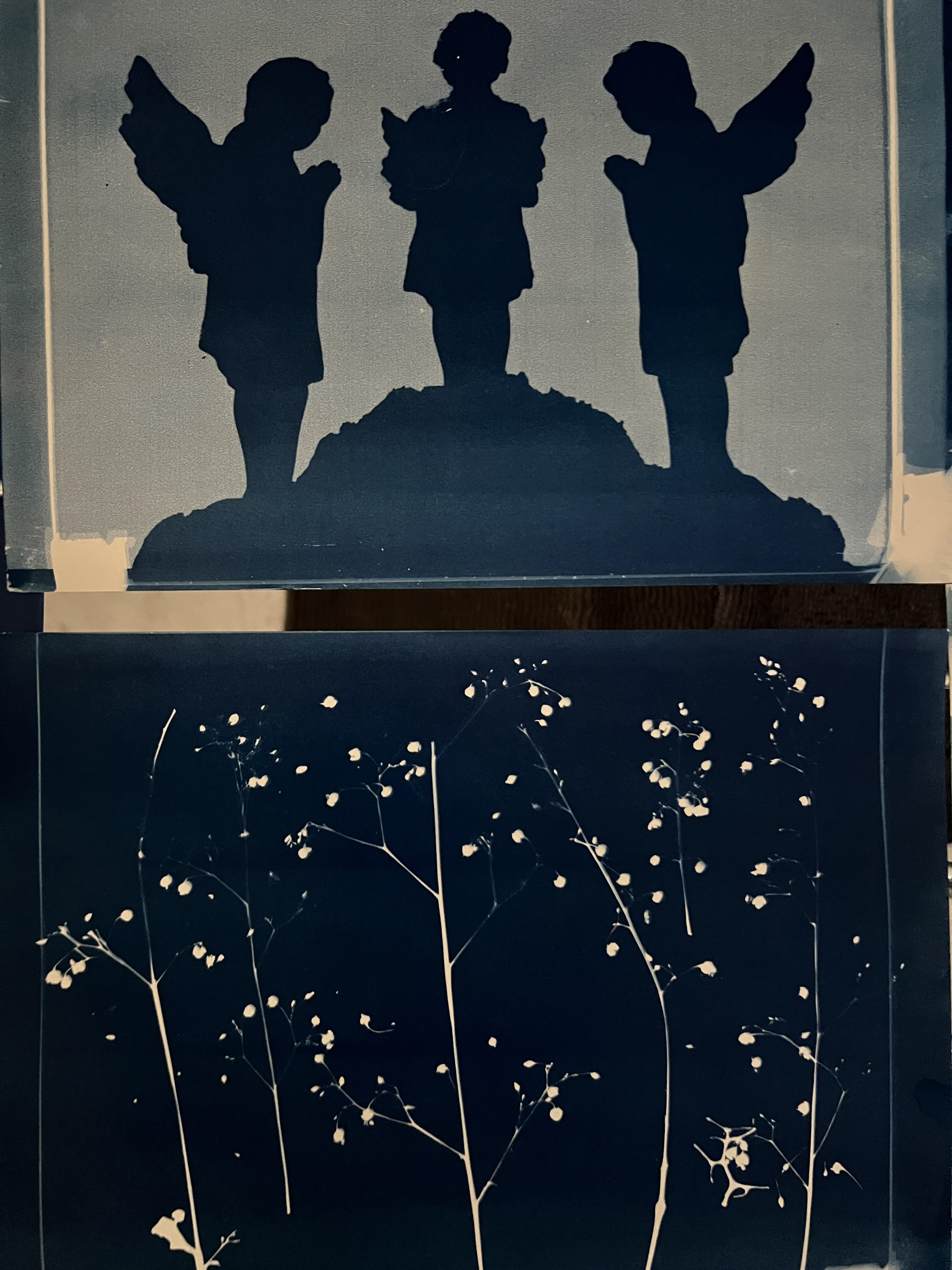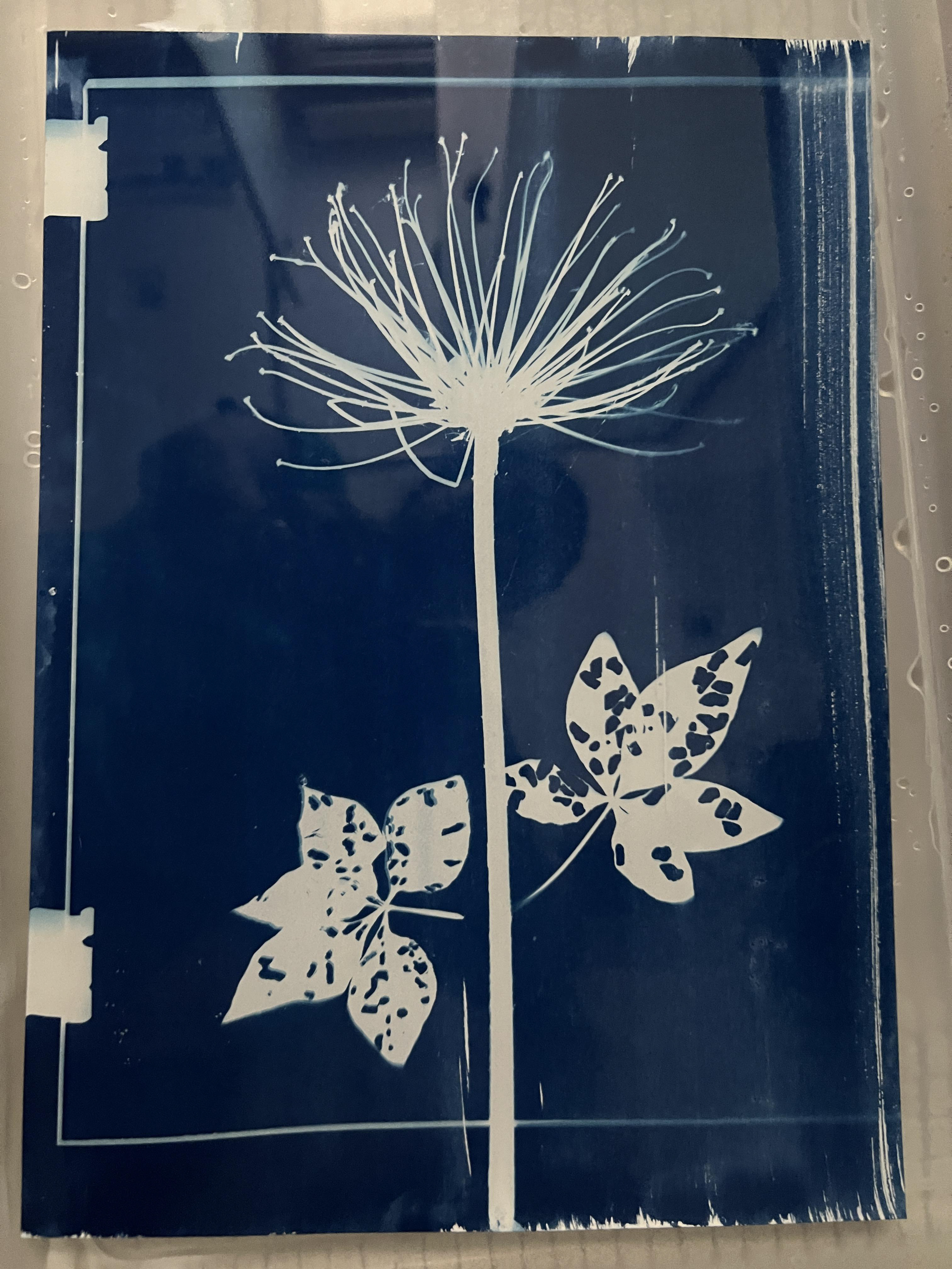 Cyanotype involves applying a chemical solution (potassium ferrocyanide and ferric ammonium citrate) to paper or other absorbent material. When exposed to light, the solution reacts, forming "Prussian Blue" in the affected areas.