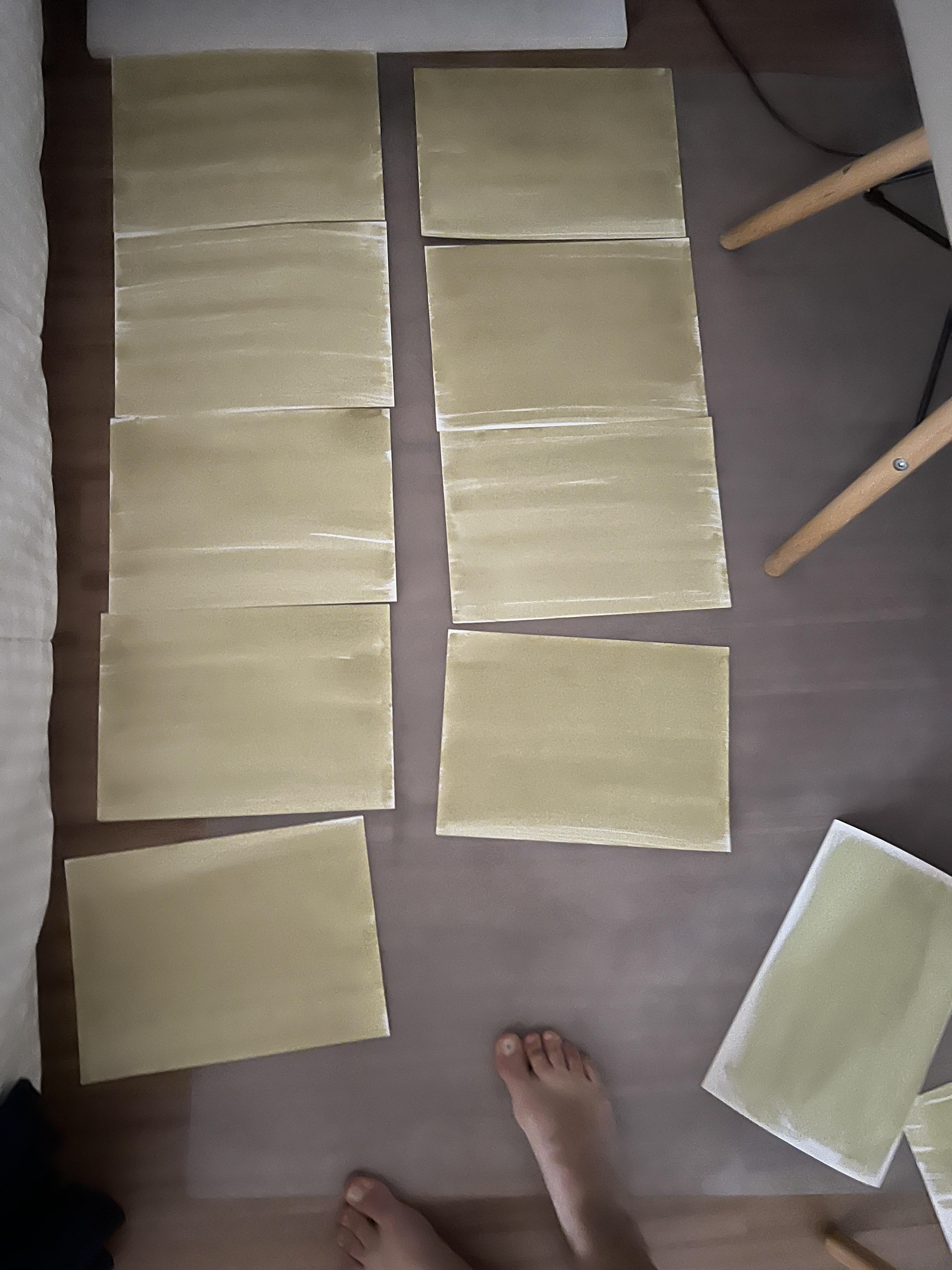Exposure to the sun of sensitized paper (or fabric) with the chemical solution, plus the acetate with the printed image (or plant or object) and glass plate on top, fixed with clips and grouped together like a sandwich.