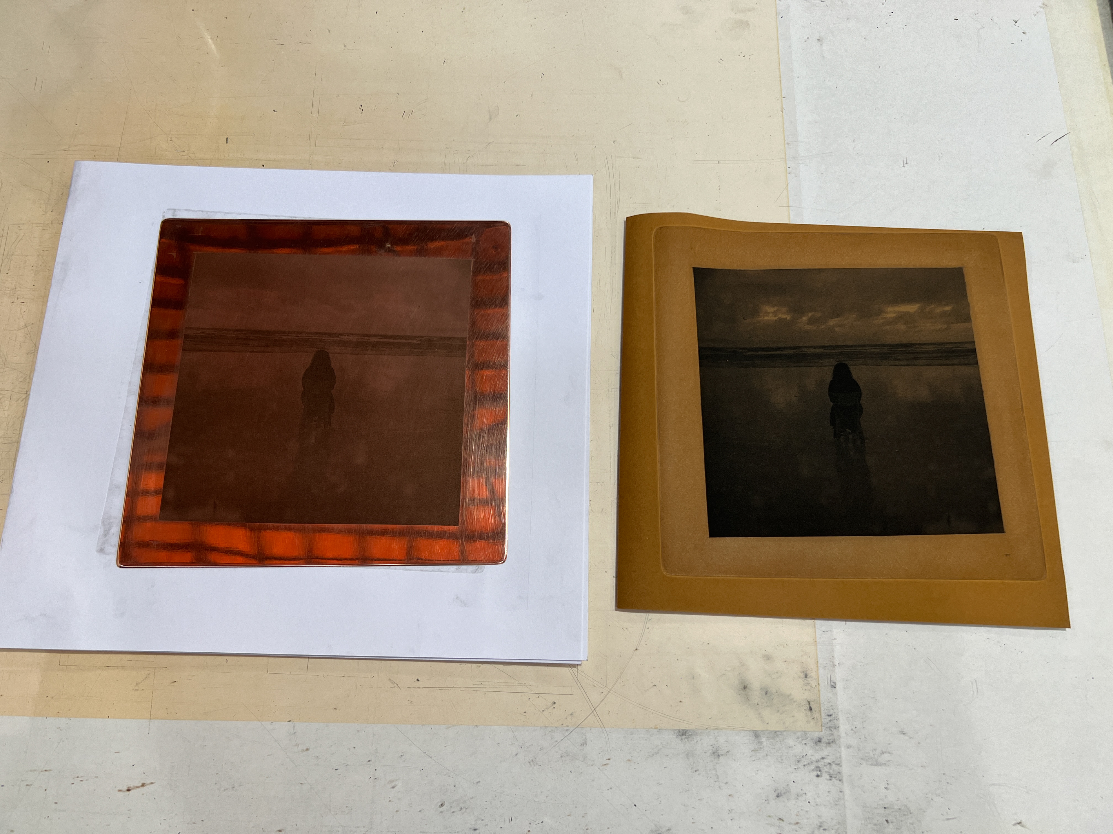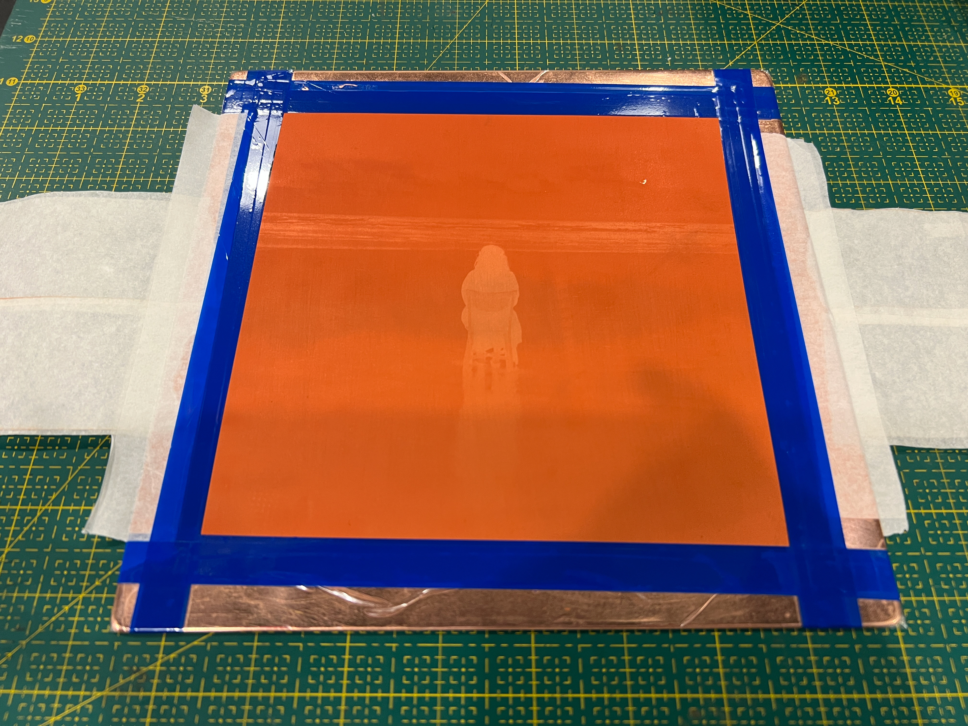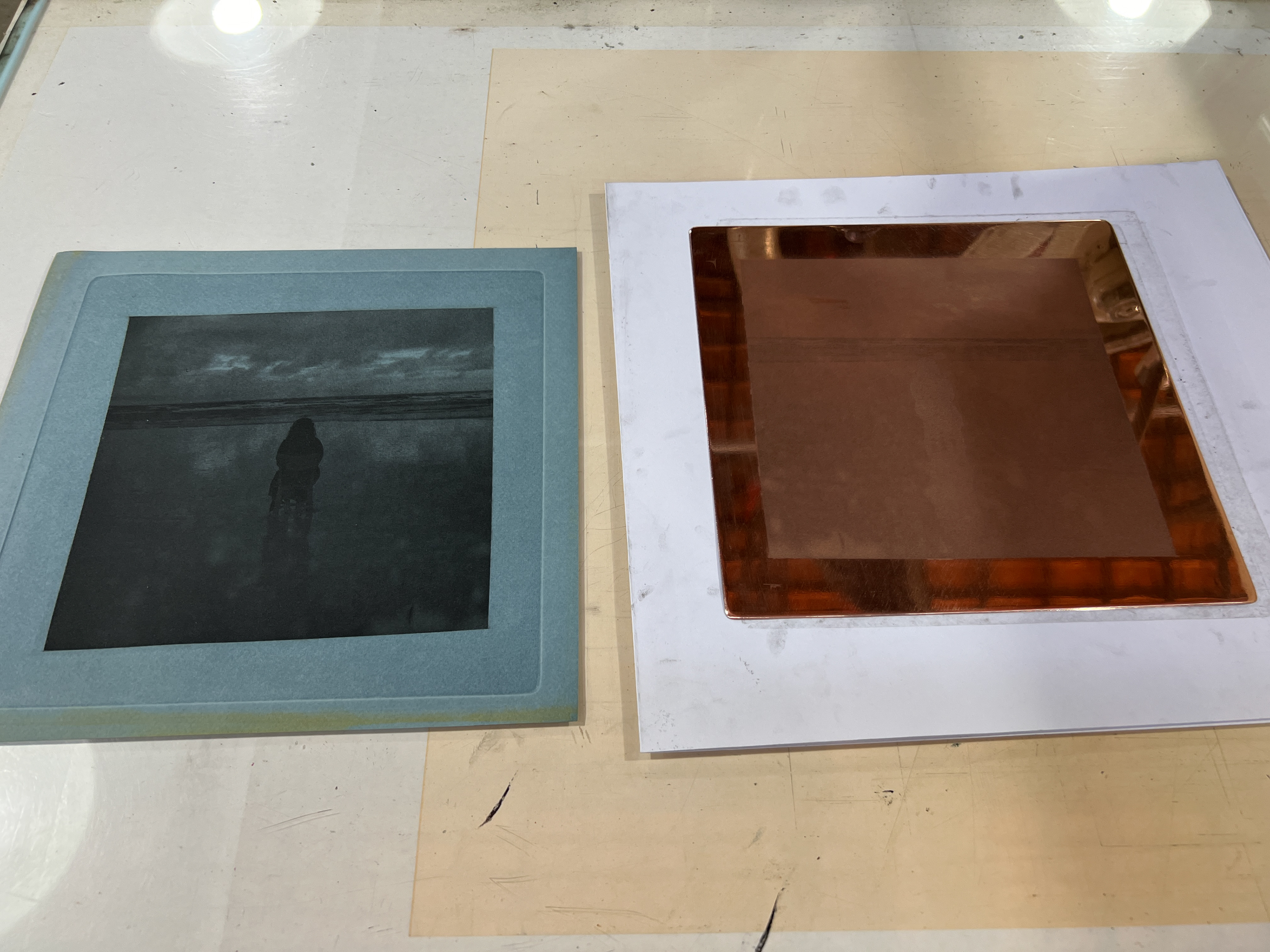 chapa de cobre 20 x 20 cm com a imagem fixada para gravação